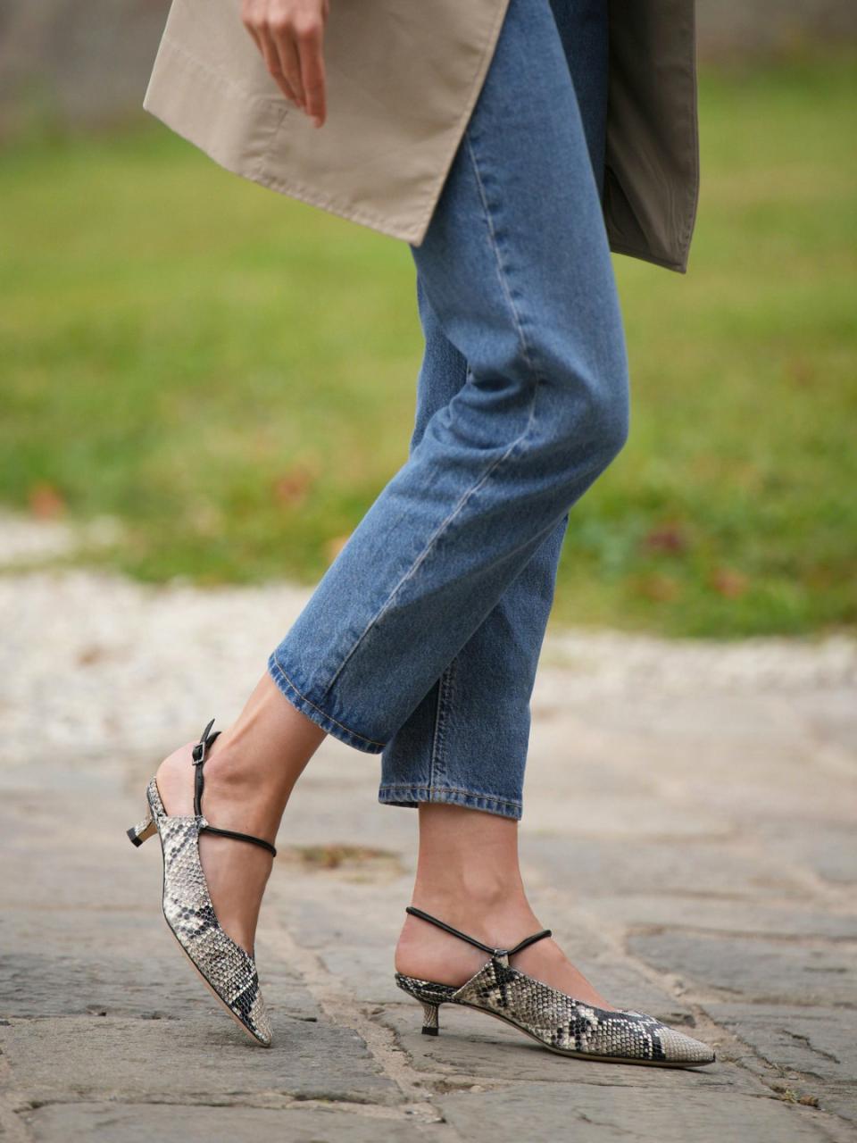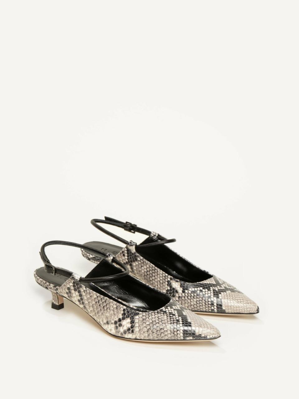 I absolutely love kitten heels, and I wanted to make one that I couldn’t find anywhere else. Crafted from python-embossed leather, The Cassandra is slingback-esque—with a tubular ankle strap that offers a distinctive contrast to its clean, angular silhouette. Wear it from the office to aperitivo hour.Italian nappa leather upper